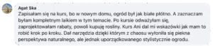 Jestem bardzo zadowolona z zakupu i realizacji kursu projektowania rabat Fajne rabaty u Ani Sikory-Stachurskiej. Brałam w nim udział w czerwcu 2024. Świetne, merytorycznie i graficznie materiały, dużo wiedzy w czasie wykładów i ciekawe zadanie praktyczne. Fajna możliwość dzielenia się w grupie Facebookowej. Moja rabata którą zaprojektowałam po kursie właśnie się rozrasta i nabiera urody. Jestem podekscytowana jak będzie wyglądać w przyszłym roku gdy rośliny osiągną docelowe rozmiary. Kurs nie tylko uczy planowania rabat, ale umożliwia rozwój cierpliwości i zmysłu ogrodniczego. Polecam bardzo!