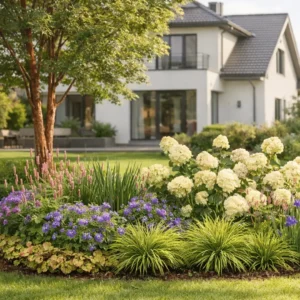 PROJEKT RABATY: Letnia rabata z hortensją bukietową.